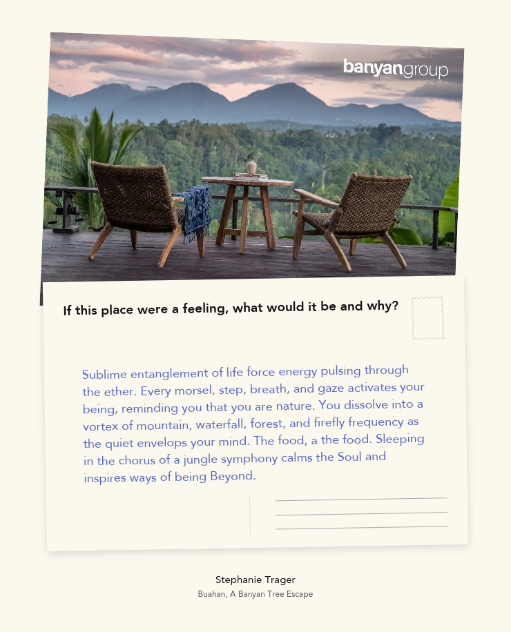 Sublime entanglement of life force energy pulsing through the ether. Every morsel, step, breath, and gaze activates your being, reminding you that you are nature. You dissolve into a vortex of mountain, waterfall, forest, and firefly frequency as the quiet envelops your mind. The food, a the food. Sleeping in the chorus of a jungle symphony calms the Soul and inspires ways of being Beyond.