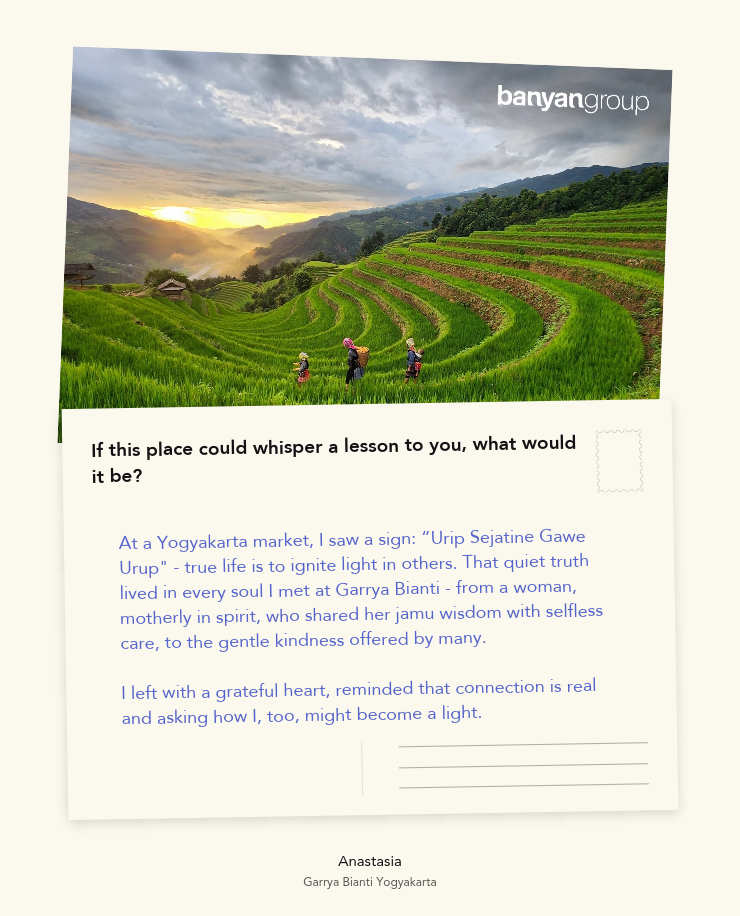 At a Yogyakarta market, I saw a sign: “Urip Sejatine Gawe Urup" - true life is to ignite light in others. That quiet truth lived in every soul I met at Garrya Bianti - from a woman, motherly in spirit, who shared her jamu wisdom with selfless care, to the gentle kindness offered by many.