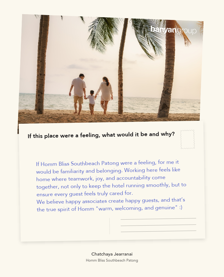 If Homm Bliss Southbeach Patong were a feeling, for me it would be familiarity and belonging. Working here feels like home where teamwork, joy, and accountability come together, not only to keep the hotel running smoothly, but to ensure every guest feels truly cared for.