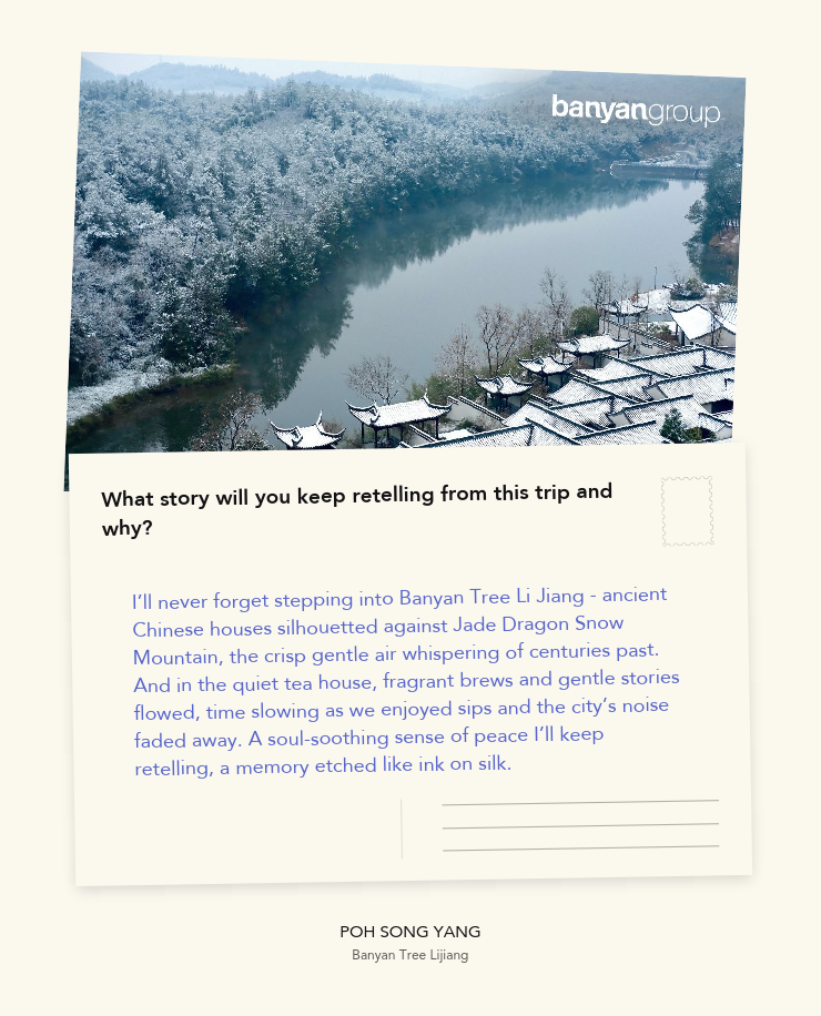 I’ll never forget stepping into Banyan Tree Li Jiang - ancient Chinese houses silhouetted against Jade Dragon Snow Mountain, the crisp gentle air whispering of centuries past. And in the quiet tea house, fragrant brews and gentle stories flowed, time slowing as we enjoyed sips and the city’s noise faded away. A soul-soothing sense of peace I’ll keep retelling, a memory etched like ink on silk.